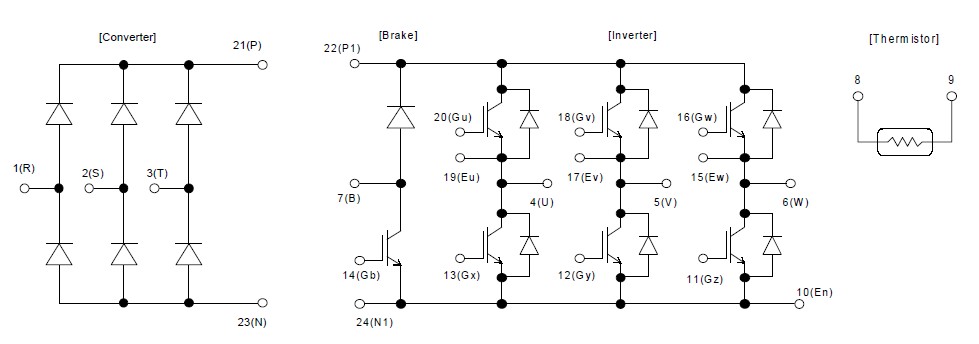7MBR50SB120-50 features: (1)Low VCE(sat); (2)Compact package; (3)P.C. board mount; (4)Converter diode bridge, Dynamic brake circuit.